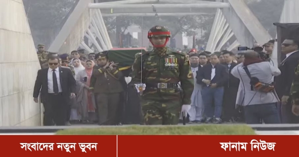 এর আগে জাতীয় পতাকায় মোড়ানো খালেদা জিয়ার মরদেহ একটি গাড়িতে করে রাজধানীর মানিক মিয়া অ্যাভিনিউয়ে নেওয়া হয়। সেখানে দুপুরের পর তাঁর জানাজা অনুষ্ঠিত হয়।