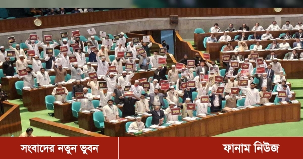 এর আগে সংসদের কার্যসূচি অনুযায়ী রাষ্ট্রপতিকে ভাষণ দেওয়ার জন্য মঞ্চে আহ্বান জানান স্পিকার। এ সময় জামায়াতে ইসলামীর নেতৃত্বে বিরোধী দলীয় সংসদ সদস্যরা নিজ নিজ আসনে দাঁড়িয়ে স্লোগান দিতে শুরু করেন। তাদের হাতে থাকা প্ল্যাকার্ডে লেখা ছিল— ‘জুলাই নিয়ে গাদ্দারি চলবে না’, ‘গণতন্ত্র চাই, ফ্যাসিজম নয়’ এবং ‘জুলাইয়ের সঙ্গে বিশ্বাসঘাতকতা বন্ধ করো’।